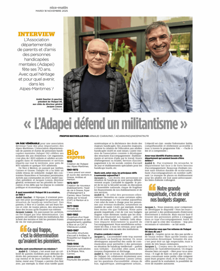 L’ADAPEI des Alpes-Maritimes est une association à but non lucratif fondée le 22 avril 1955. Affiliée à l'UNAPEI reconnu d'utilité publique, elle accompagne aujourd’hui près de 1 820 enfants et adultes en situation de handicap et/ou de vulnérabilité. Ce soutien s’organise au sein de 45 établissements et services répartis dans tout le département.